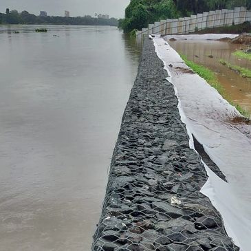 Turn-Key Gabion Retaining Wall solutions for river bank erosion control from Need Based Geoengineering Survey to Technical Installation/Commissioning of Reliable Gabion Retaining Walls and Structures using Gabion Mattresses and Gabion Boxes manufactured by Mechanically Woven Double Twist Hexagonal Opening (60x80,80x100 and 100x120mm) Gabions made out of Zn+PVC Coated wires of Dia 3.7mm(2.7mm+1mm PVC) for Box, Selvage 4.4mm(Dia 3.4mm+1mm PVC) & Lacing 3.2mm (2.2mm+1mm PVC) with combination of various size gabion boxes.