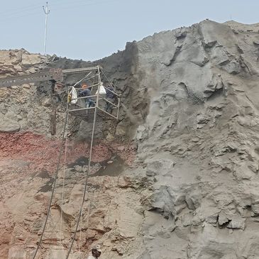Rock Fall Protection using Mechanically Woven Double Twist Gabion Mesh, Wire Ropes,Flexible Wire Rope Nets, Geotextile using rock anchors as defined intervals as per drawing.